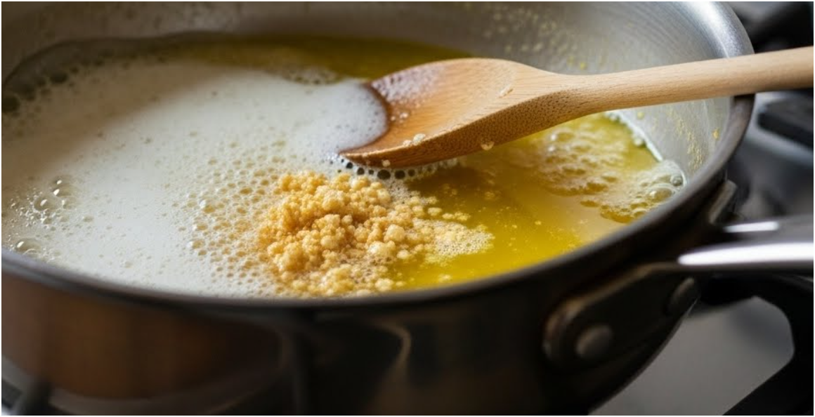 버터가 녹기 시작하면 표면에 거품이 올라오는데, 이때 절대 저어서는 안 됩니다. 유당과 수분이 분리되는 과정으로, 자연스럽게 거품이 사라질 때까지 약불로 유지합니다.