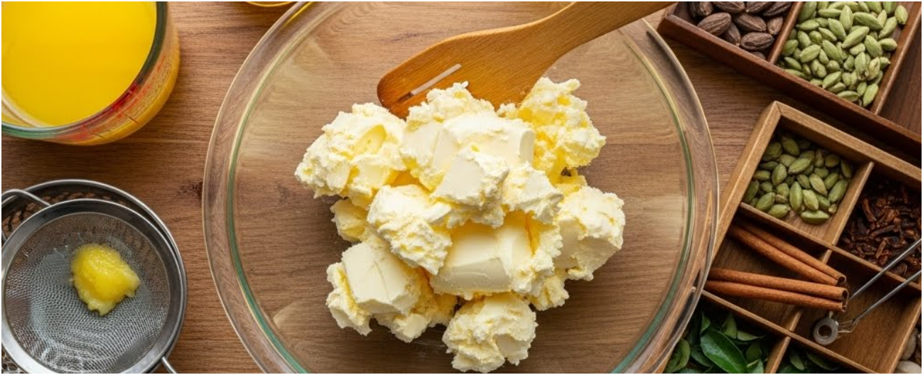 버터는 실온에 미리 꺼내어 약간 말랑한 상태로 준비합니다. 너무 차갑거나 바로 가열하면 분리가 고르지 않게 진행될 수 있습니다.