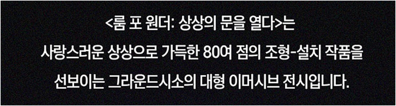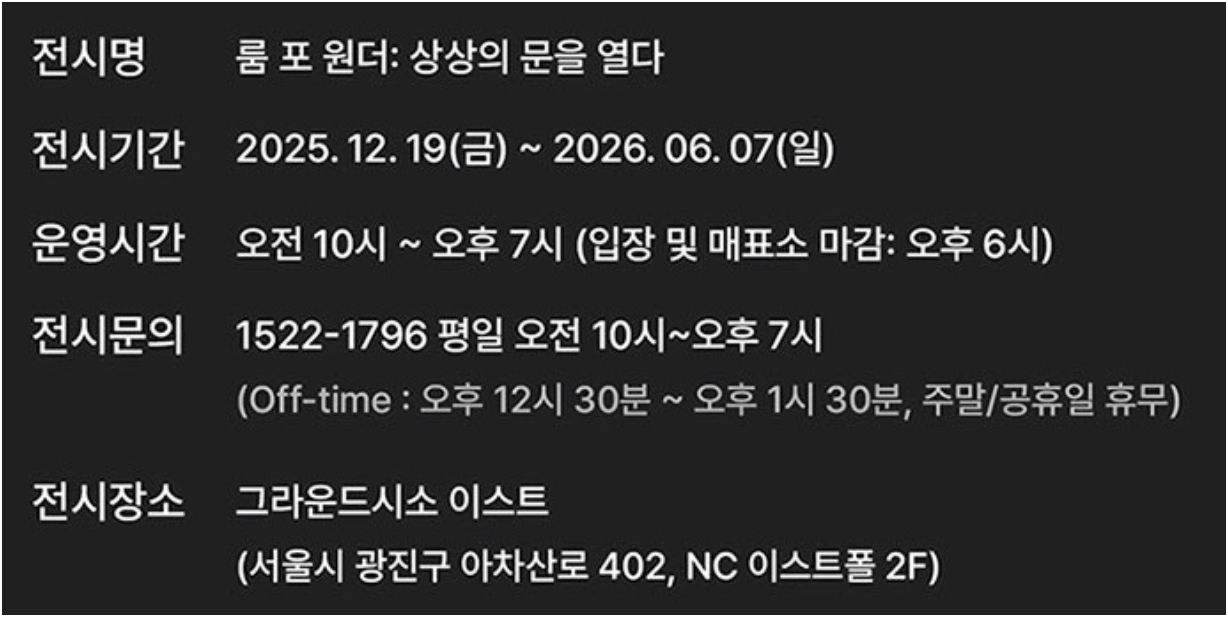 위 정보를 참고하면 룸포원더 전시를 보다 효율적으로 즐길 수 있습니다.